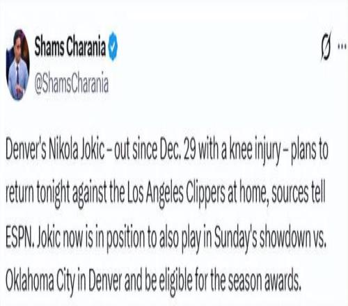 Shams曾在1月中旬表示,掘金队对于约基奇能在当月月底前复出持乐观态度。但在本周三的一档电视节目中,他又指出,这位三届常规赛MVP得主将在下周接受复查,为确保其身体状态完全恢复,掘金队准备将他的归队时间比最初预期再推迟一段时间。